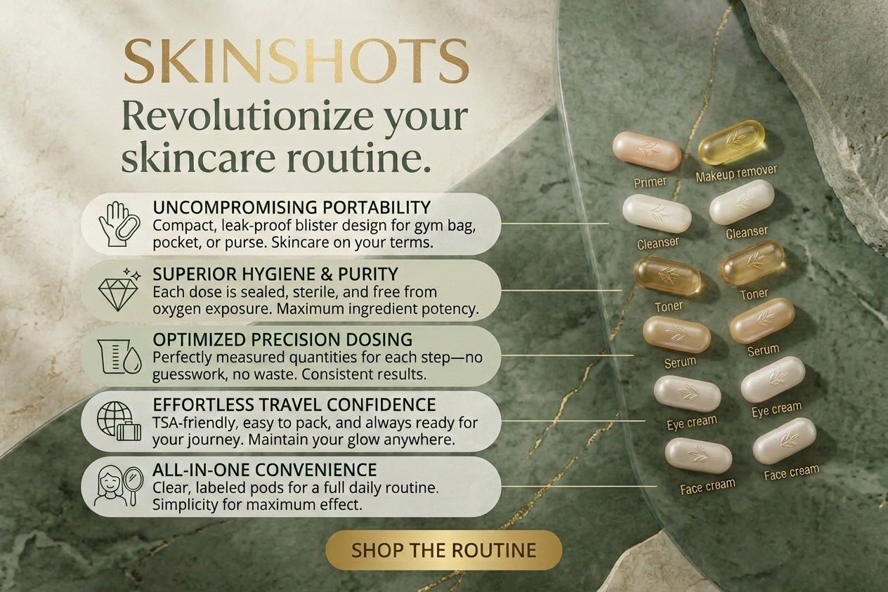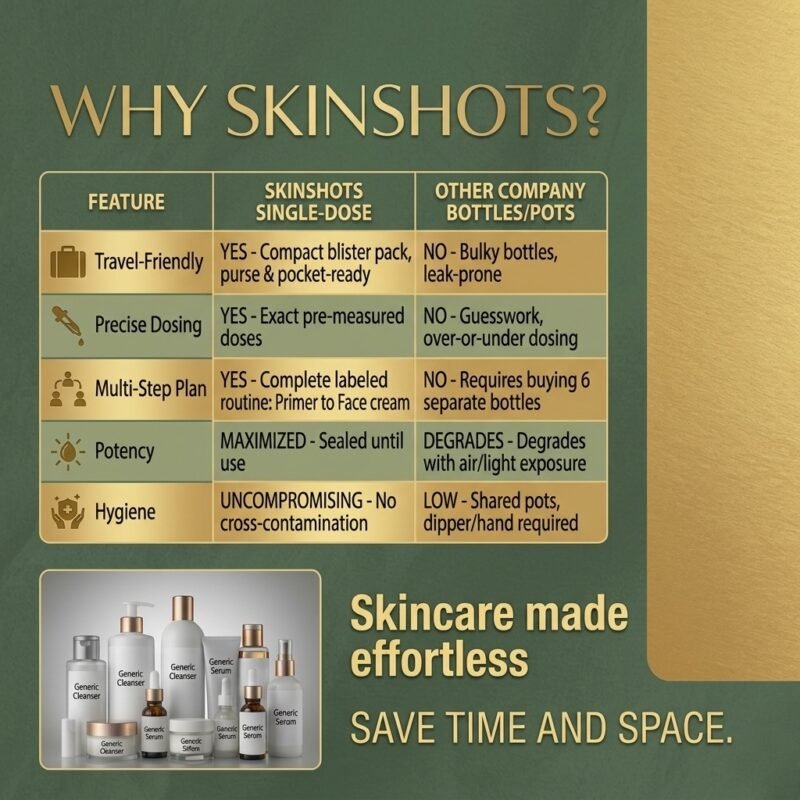 Skin Shots is designed for modern lifestyles, combining a complete skincare routine with simplicity, hygiene, and thoughtful formulation. Each capsule delivers the right amount of care, making skincare easy, travel-friendly, and consistent for those who value convenience and effective daily routines. ✨